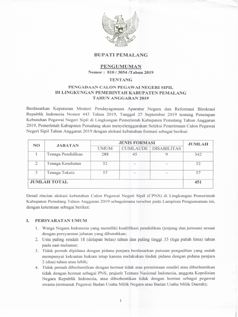 Pengumuman Penerimaan Cpns 2019 Kabupaten Pemalang Pdf