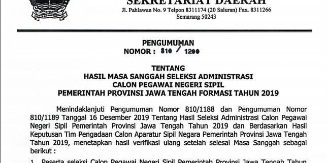 Pengumuman Hasil Seleksi Administrasi Cpns Pemprov Jawa Tengah 2019