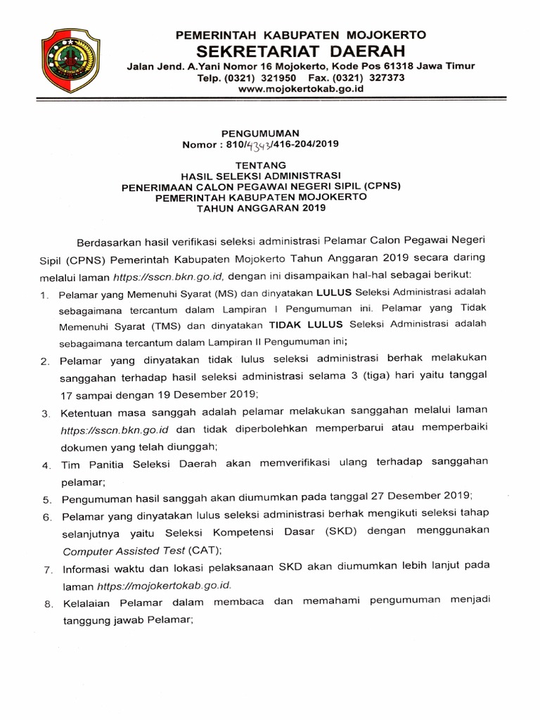 Hasil Seleksi Administrasi Cpns Kabupaten Mojokerto 2019