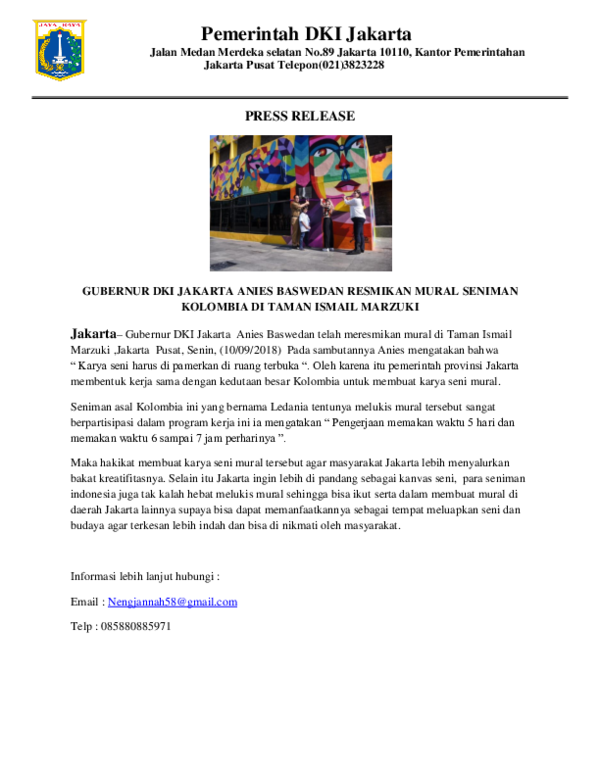 Doc Press Release Gubernur Dki Jakarta Anies Baswedan Resmikan Mural Seniman Kolombia Di Taman Ismail Marzuki Christya Monica Academia Edu