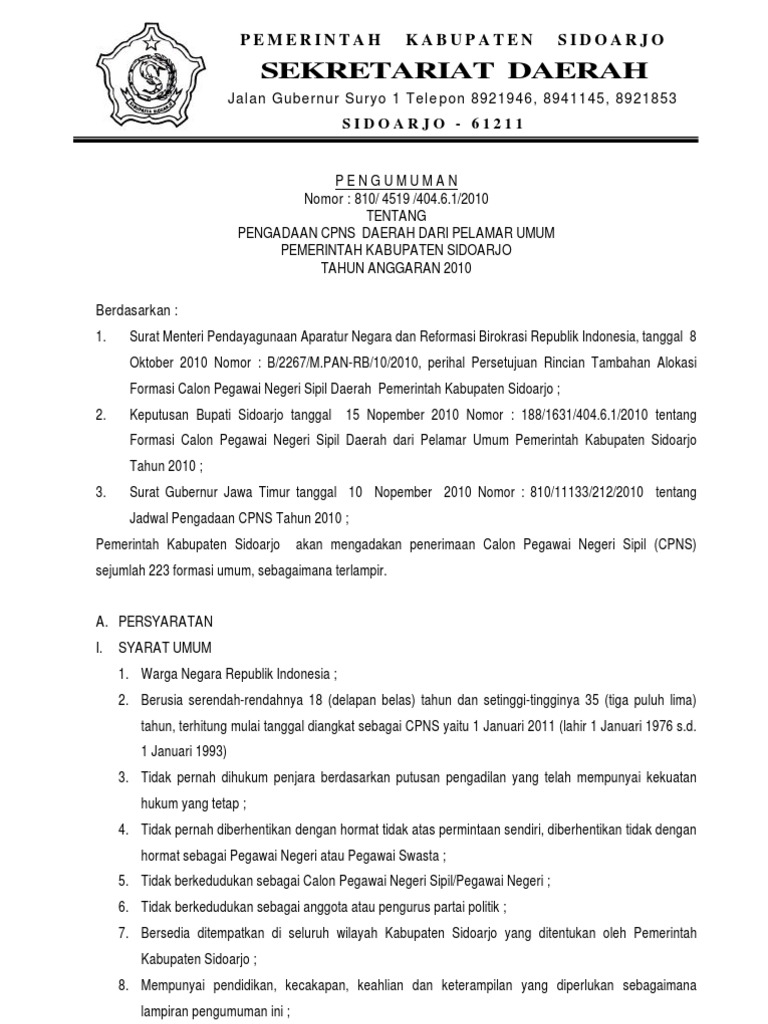Pengumuman Hasil Seleksi Administrasi Cpns Kabupaten Sidoarjo Jatim 2018 Verifikasi Berkas Asli Tipssehatcantik Com
