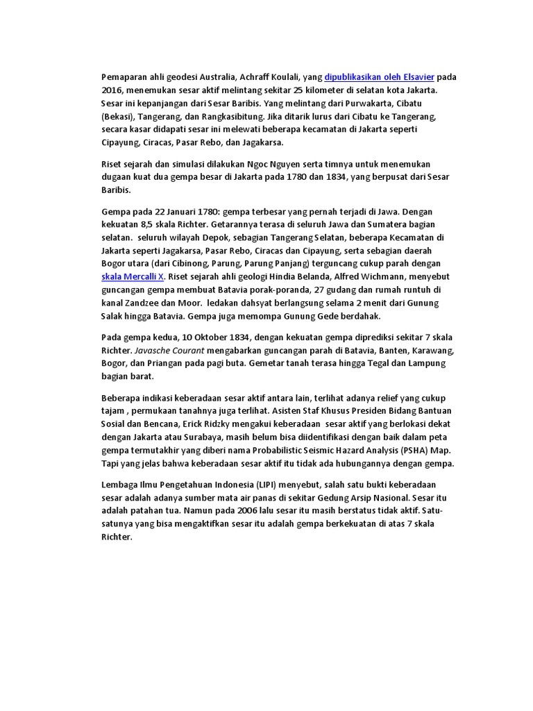 Oct 29, 2017 · jakarta pernah mengalami gempa besar pada 1780 dan 1834, yang berpusat dari sesar baribis faktor politik dan ekonomi di jantung ibu kota indonesia membuat para peneliti ragu mencantumkan jakarta dalam peta gempa nasional terbaru.